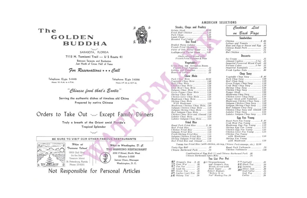 Just north of the Circus Hall of Fame between Sarasota and Bradenton Florida, The Golden Buddha promised "a breath of the Orient amid Florida's Tropical Splendor" and served mid-20th century "Chinese food that's Exotic." There were sister restaurants in St. Petersburg, Toy Reef, and the famous Nanking Restaurant in Washington, DC. The "Tony Special Banquet" was offered starting at $40 and meatless dishes included Chinese Cheese (an authentic fermented tofu).