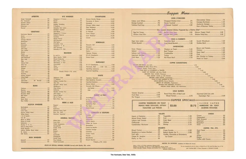 What's a naked lady, her modesty covered by only a few palm fronds, doing in New York in the early 1940s? She's gracing the front cover of the menu of the legendary restaurant and nightclub The Hurricane. This nightspot in the Brill Building evoked the atmosphere of the South Pacific, with a décor of palm trees and tropical flora and fauna. Big band leader Duke Ellington played here and it was one of the first nightclubs to have an integrated clientele. It operated from 1940 to 1944. The image, created by Chicago artist Wesley Morse who also illustrated covers for El Morocco and The Copacabana among many others.