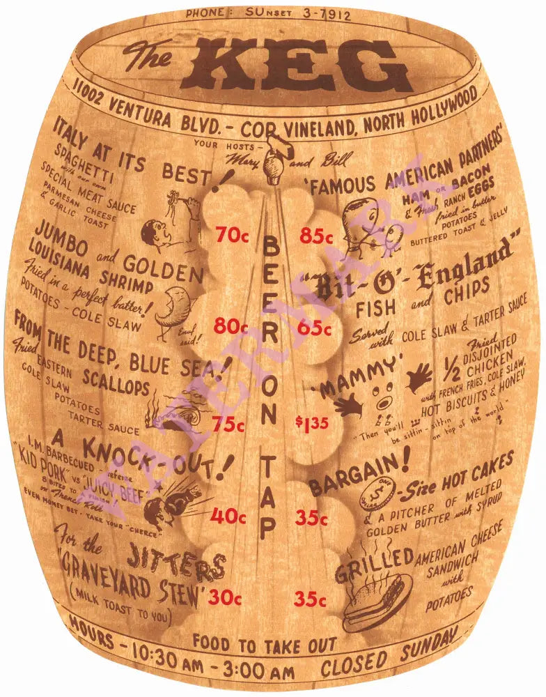 This is a wonderful example of American folk art – a menu designed with humor and flair. The owners Mary and Bill – we are assuming they were a married couple – obviously put a lot of love into their humble diner in North Hollywood where the priciest dishes cost $1.35. There is a lot to see on this two-dimensional 1940s menu – the intimidated diner holding a forkful of spaghetti, two potatoes shaking hands with each other and the barbecue that is described as a “knockout.” Both Bing Crosby and Bob Hope lived nearby and we like to think at least one of them and other movie stars dropped in. The Keg is no more, of course, and we’ve been unable to find out much about it. If anyone knows more, we’d love to hear from you.