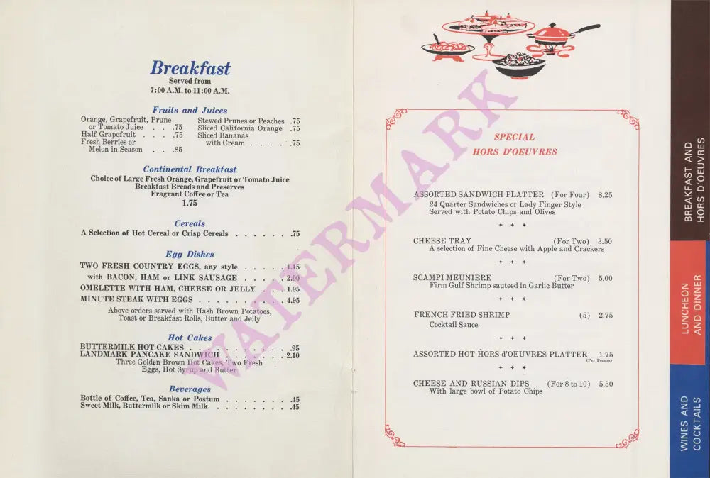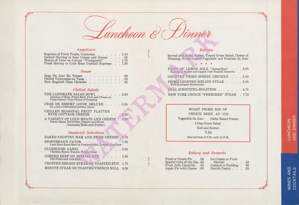 This menu cover which shows the Landmark’s Tower ablaze with lights at night is from the 1960s.