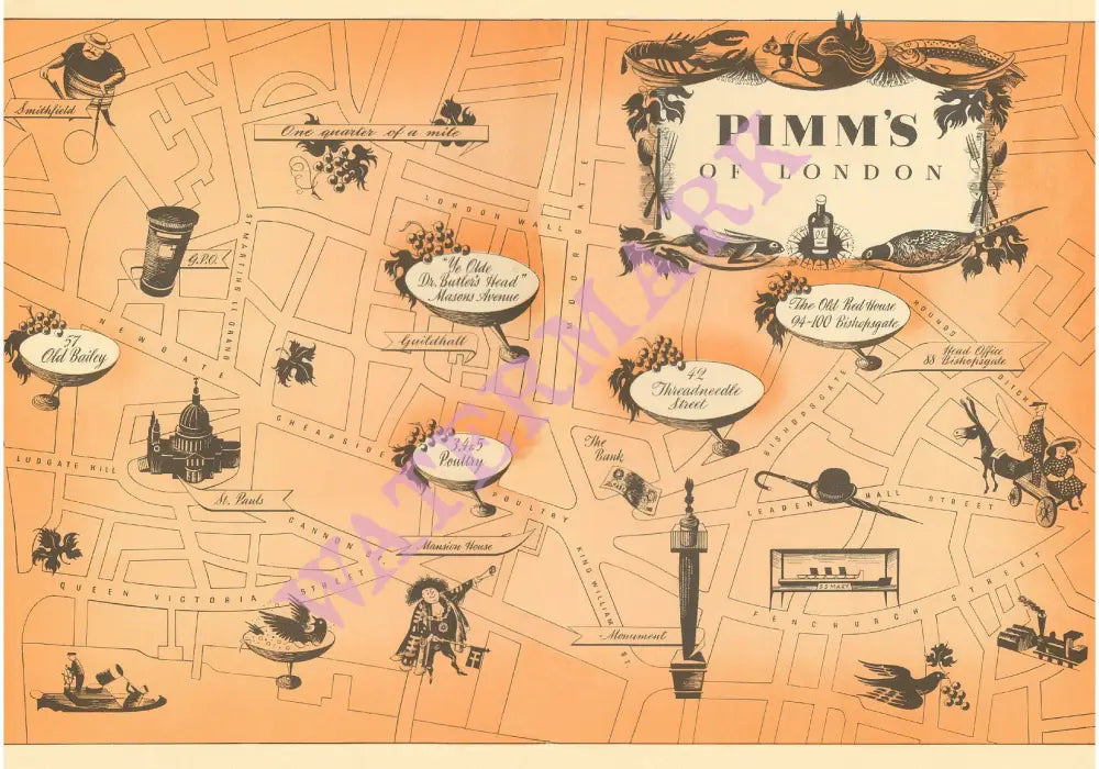 There was a limit on what and how a guest could order at The Old Red House, a couple of doors from Pimm's Head Office in the City of London. This was a vestige of World War II food rationing that was required by the English government. One could order fish or meat but not both. There was a limit of 3 courses per person that could not exceed 5 shillings in cost - there were 25 shillings in one pound. To put that in perspective a haircut cost 1 shilling in 1949. We have always been charmed by menu covers which are illustrated with map and this one is no exception.