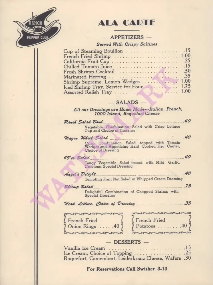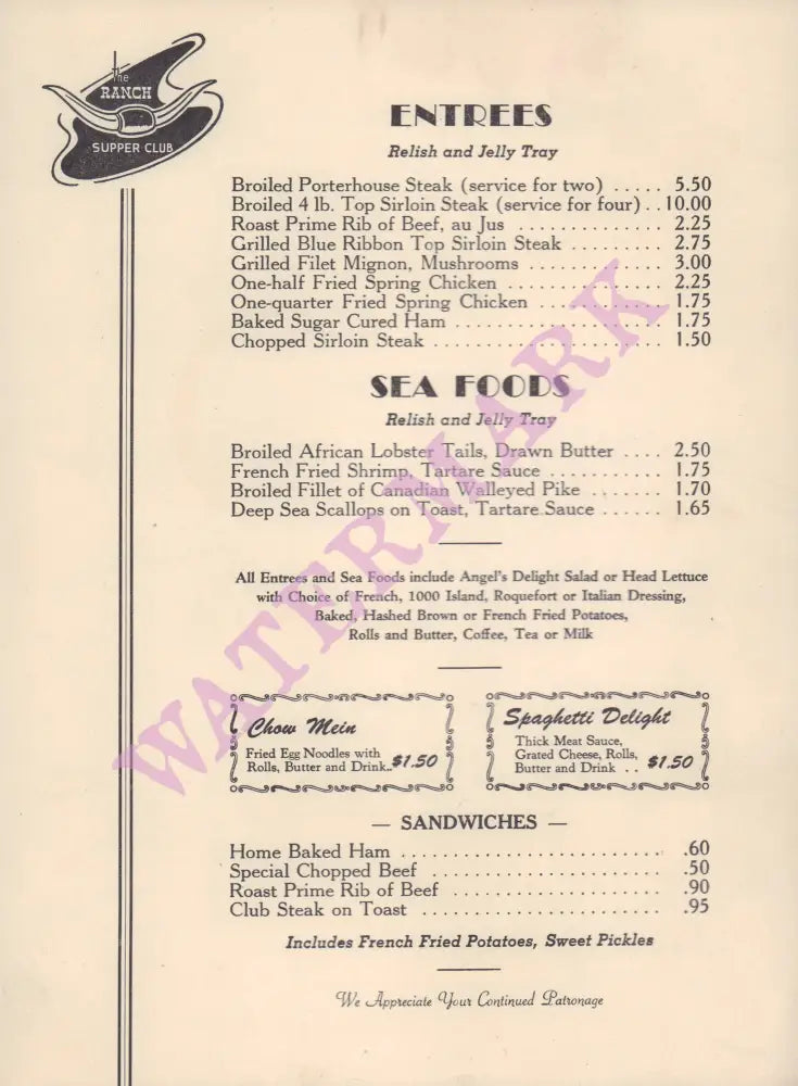 This stylish menu cover was perused by customers of the Ranch Supper Club in Cou Falls, Iowa, in the 1960s. With its marvelous fonts and elegant illustration – the artist’s initials FS are to the right – it’s a great example of menu design.