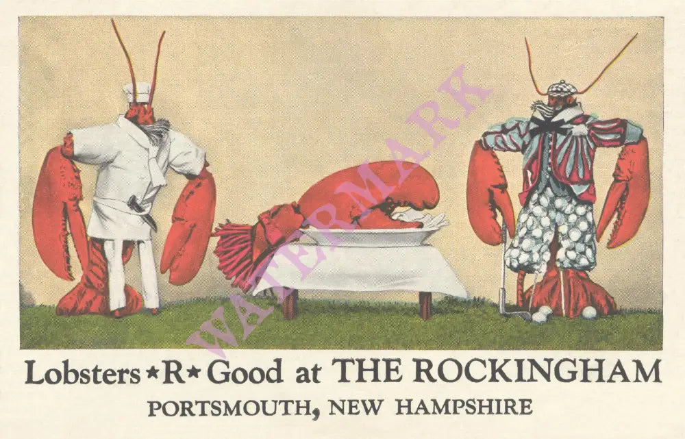 This menu illustration from the grand and historic Rockingham Hotel in Portsmouth, New Hampshire, is more than a hundred years old but looks as if it could have been drawn yesterday. Even the Lobsters R Good message seems modern – and who knew lobsters played golf?