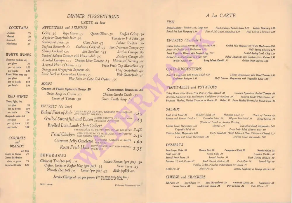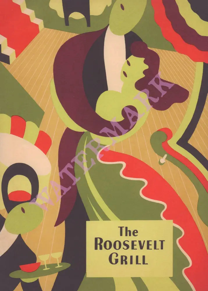 This highly stylized menu cover was for the Roosevelt Grill, a restaurant within the Roosevelt Hotel in New York City.