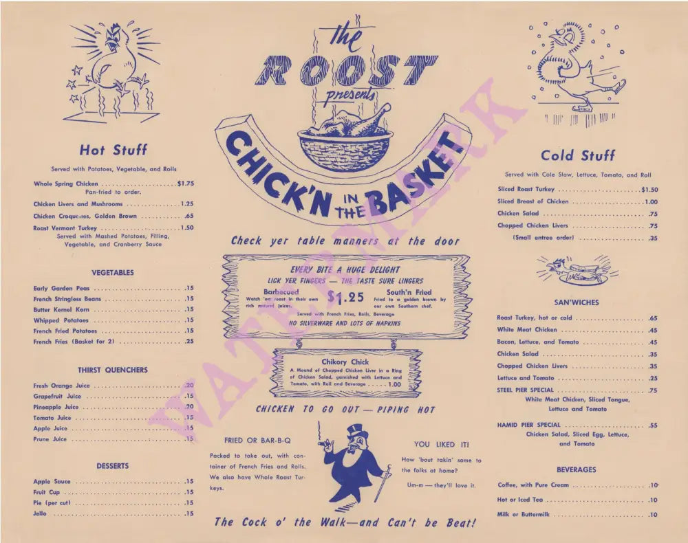 Humor was an important part of marketing restaurants in the 1940s and this is a marvelous example from The Roost, a restaurant in Atlantic City, New Jersey. It depicts a chicken standing in front of a judge and jury of its peers and hearing the announcement “Guilty – Sentenced To Fry.” A court bailiff stands to the side, ready with a frying pan behind its back. Of course, this might be deemed rather cruel humor by today’s standards, but it would have been a good way to grab people’s attention since eating fried chicken wasn’t particularly common during this era, except in the South. The interior menu is also a graphic feast with anthropomorphized chickens ice-skating, feeling the heat on the griddle and stuffed in sandwiches. A dapper chicken in a top hat and dinner suit, carrying a cane and smoking a cigar, advertises take-away. In the 1940s, before air-conditioning and foreign travel was the norm, millions of people flocked to Atlantic City’s miles of boardwalk to enjoy the beach and have fun in the seaside mecca’s resorts. Like The Bird In Hand restaurant in New York which also depicted the chicken-sentenced-to-fry image on its menu covers, The Roost helped popularize the concept of eating brined and buttermilk-soaked fried chicken with your fingers for city folk.