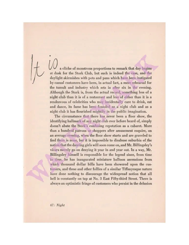 "Stork Club: Sherman Billingsley’s “glammer school,” strict in its standards any infraction of good manners in punishable by quiet but prompt expulsion and permanent blacklisting. Even the atmosphere you breathe is specially cleaned and filtered. Lighting is just right and service incredibly wonderful. Food? Anything you desire. Drinks? Any brand you name. If your party is sizeable and squired by someone of the successful business-executive type, the waiter will look surprised if no champagne is ordered. Layout consists of; islanded bar confronting you as you enter; cocktail lounge, off which are the glassed-in main dining room ( dining and dancing) and the Club Room ( small, quiet, seating only about 100) and upstairs a small Loners’ Room for singleton eating and the Blessed Event Room for private-party occasions. The Stork Club opens at 11 am for the benefit of late breakfasters. Packed at lunchtime with the Cub Room operating on a men-only basis. Cocktail time, crowd has a choice of the bar, the lounge or the main room where there’s music for cocktail dancing – followed by music to eat to. If you’re elegantly thrifty in a leisurely sort of way, you’ll take the flat-priced five-course BT (before taxes)( Dinner. Should you prefer to be fed faster, there’s a BC Dinner at stepped-up tempo for theater curtain beaters. Dance tempo ( and cabaret tax) resume at 9 with never a skipped beat till closing, and with a continuous two-way traffic of Stork glamorites arriving and departing. Attire is optional but when tables are scarce, strangers may find it to their advantage to present themselves at entrance chain (solid gold) in their best evening togs. A young college man escorting a dazzling goddess is sure to get in, because Mr Billingsley is proud of having his tables embellished by the fairest. Sunday opens at 1pm."