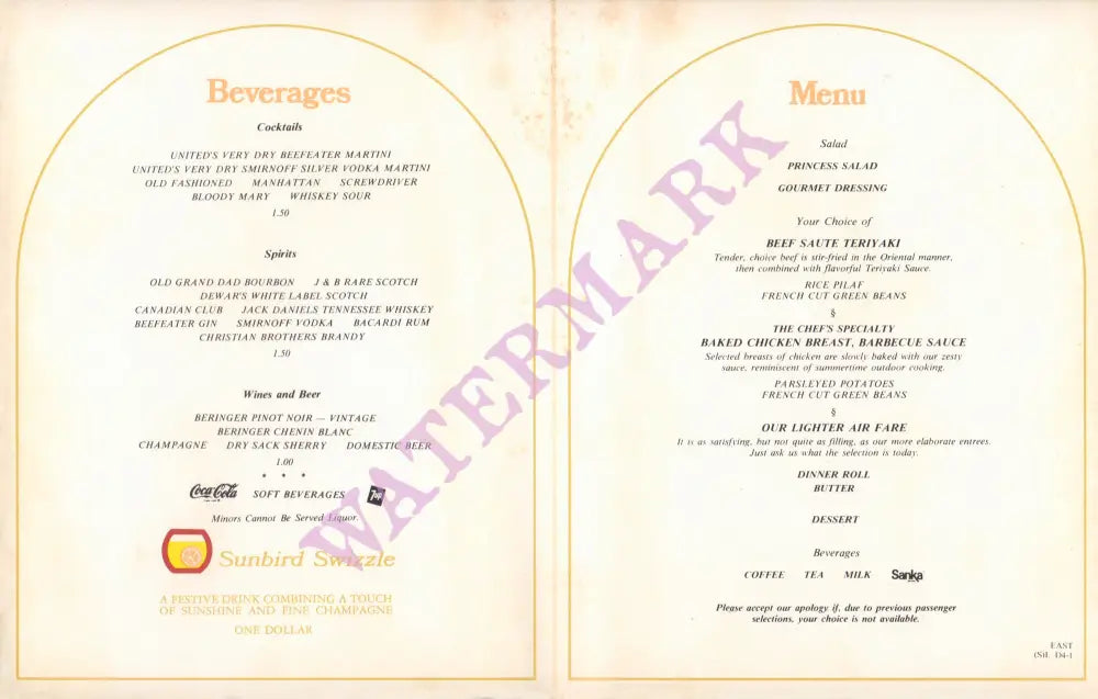 This in-flight menu was created for The Sunbird Service, flown by United Airways to destinations such as Florida, Arizona and Mexico. It must have been a welcome sight to many an excited air passenger in the 70s and 80s and is also a reminder of how catering on board aircraft has – to put it politely – changed quite a lot.