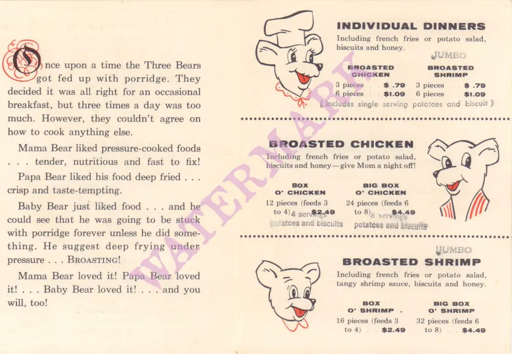 Each member of the family also features on the interior menu of food to eat in the car or take home. And yes, porridge was off the menu for these bears. Instead, customers could choose from hamburgers, french fries, shakes, broasted chicken and shrimp.