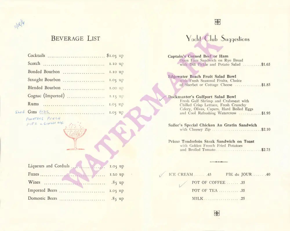 This 1961 menu is from the Yacht Club, one of the resort’s restaurant and cocktail bars. Not surprisingly, the establishment had a nautical theme and served seafood, including lobsters flown in from Rockland, Maine.