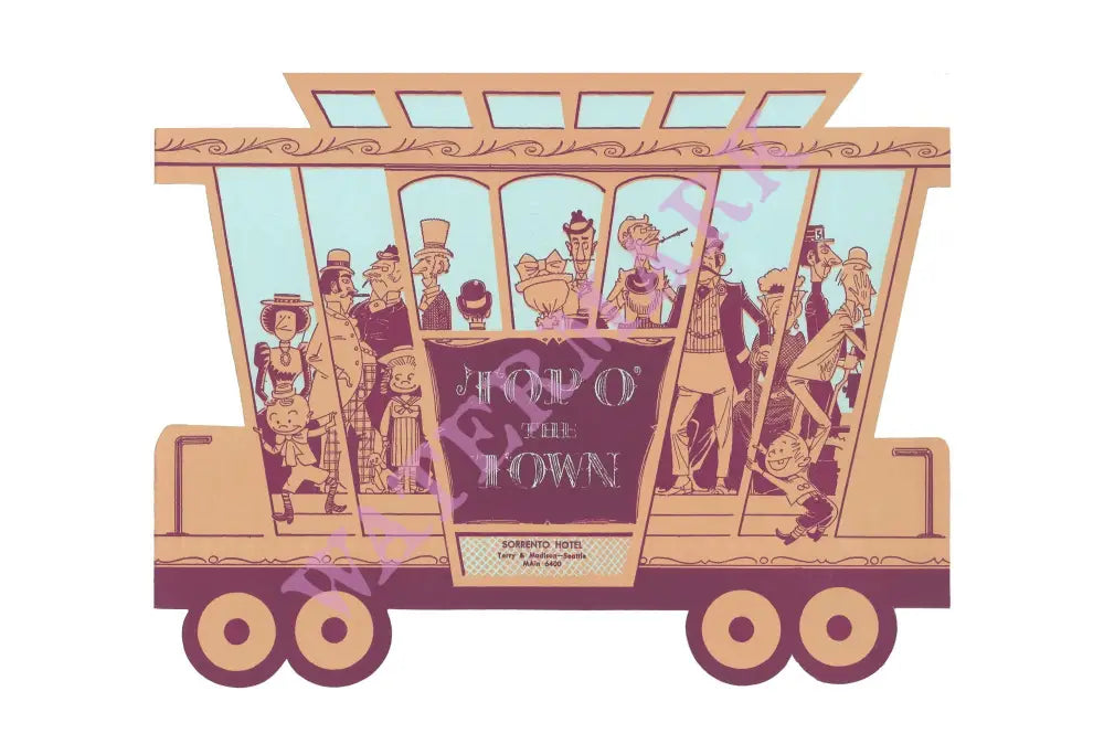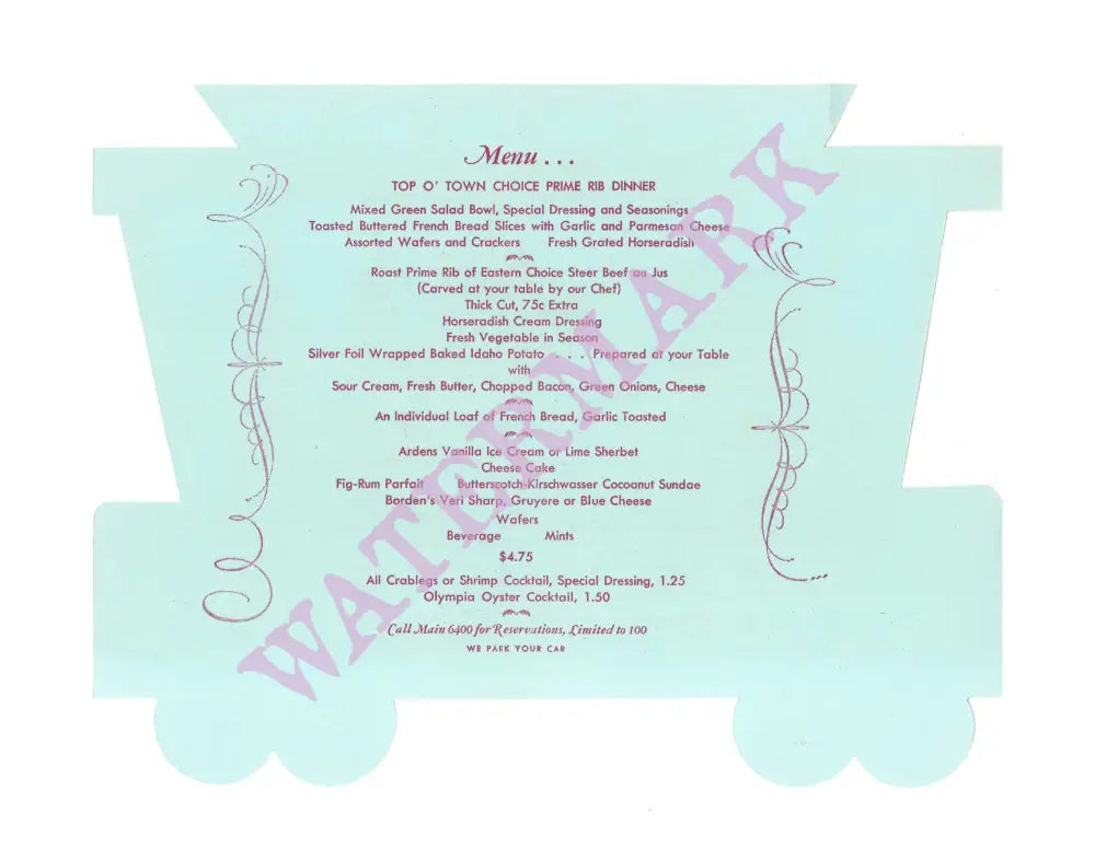 The Top O’ The Town restaurant sat on the seventh floor of the historic Sorrento Hotel from the 1930’s through the 1950’s and, at the time, was the city’s highest restaurant. The Sorrento Hotel was built in 1908 in advance of the Alaska Yukon Pacific Exposition (Seattle's first World's Fair) and, in honor of that era, the menu is die-cut in the shape of an original Seattle streetcar.