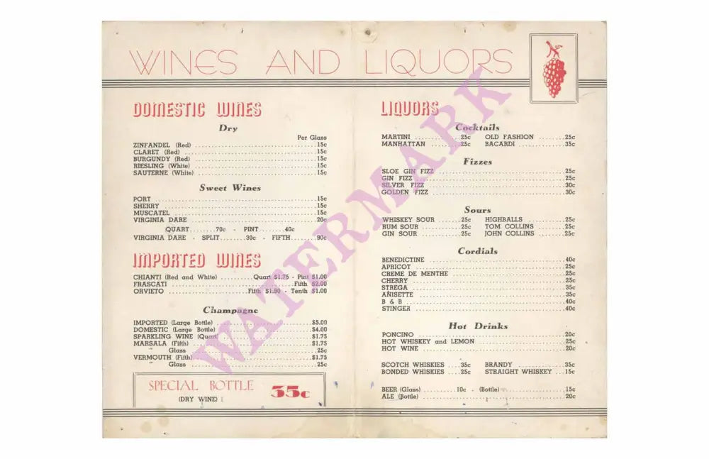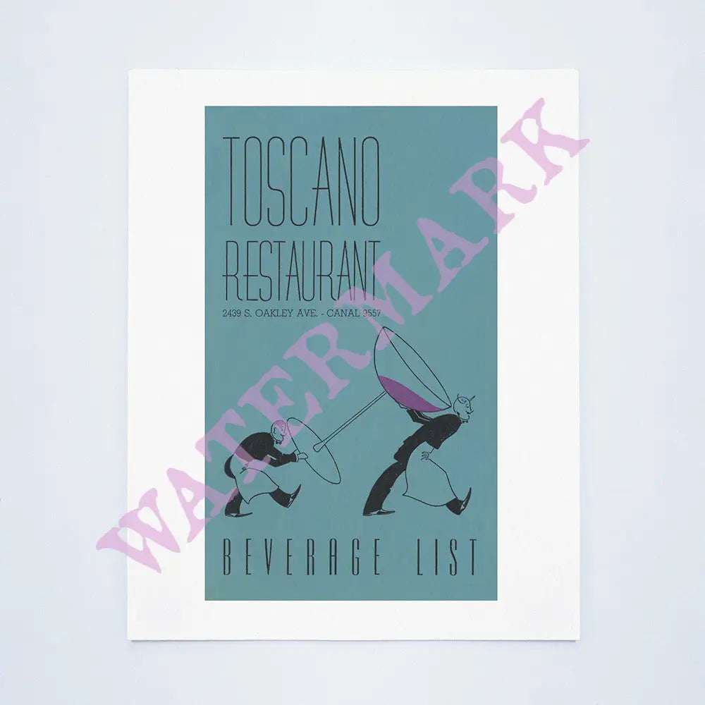 This 1940s beverage list of two waiters manfully carrying a giant cocktail glass is a lovely reminder of Chicago’s other Little Italy on the city’s lower west side. Both men, in their white aprons, look as if they are expending a lot of energy in bringing the glass to a customer’s table. This imaginative cover art was from Toscano, which opened in 1923 and which stayed in business for over 60 years.