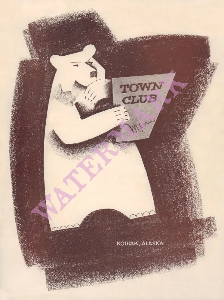 It was clever of the unnamed artist, therefore, to use one of these magnificent creatures on the cover of the Town Club menu in Kodiak. The bear has the menu in his powerful paws and an expression on his face of ‘ hmm... What will I have?’