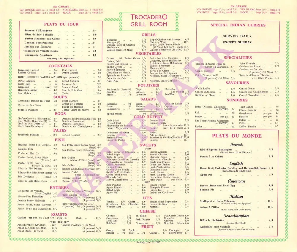 This elegant menu is from 1953 and offered an enormous menu, with prices in pounds and shillings. The Trocadero closed in 1965.