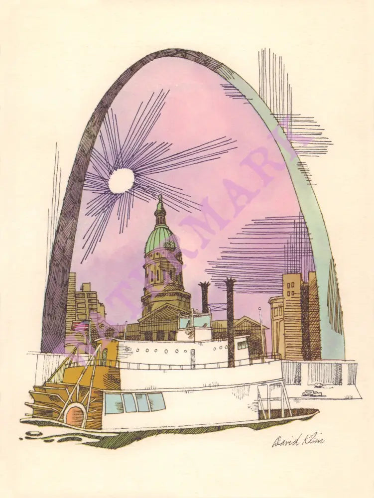 This beautiful image of St Louis was created by the influential American artist David Klein, who produced posters for Broadway theatre productions, Hollywood films, the US Army and various corporate clients.
