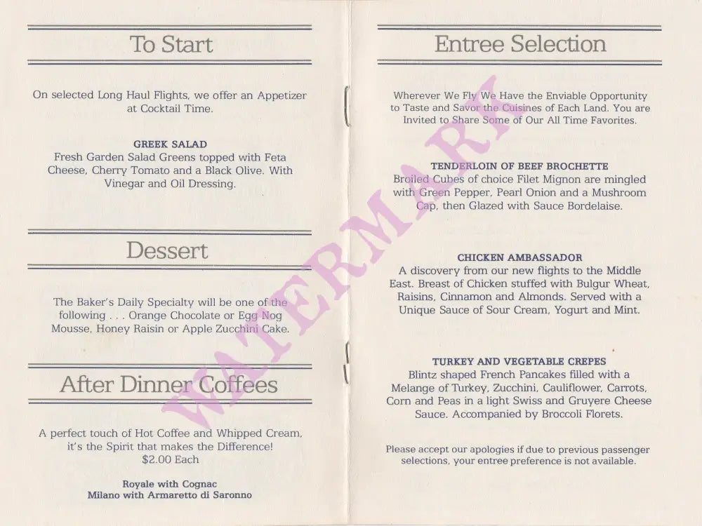 This wonderful piece of TWA menu art, from the 1970s, was created by renowned artist Bob Peak who worked extensively for the airline. Peak, was also known as the “father of the modern movie poster”, with over 100 posters for films such as West Side Story, My Fair Lady, Camelot, Rollerball, Star Trek, Superman and Apocalypse Now.