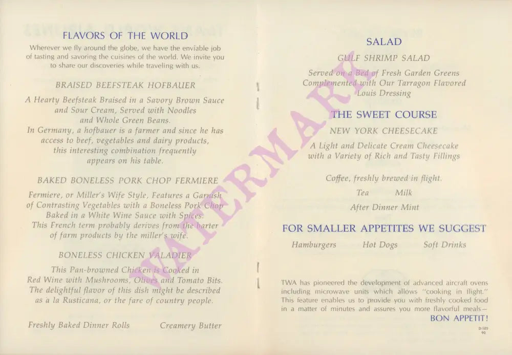 "London, the seat of the British Commonwealth, is one stop on TWA's worldwide routes. The mighty Tower of London, as seen through the Tower bridge, dominates the skyline. Today this great fortress is the home of the famous Beefeaters and the Crown Jewels. The Tower, which at one time commanded the river approaches to London, was built by William the Conqueror nearly 900 years ago. Other framable color renderings of our Collector Series - Great Cities of the World - are presented periodically on various flight segments.