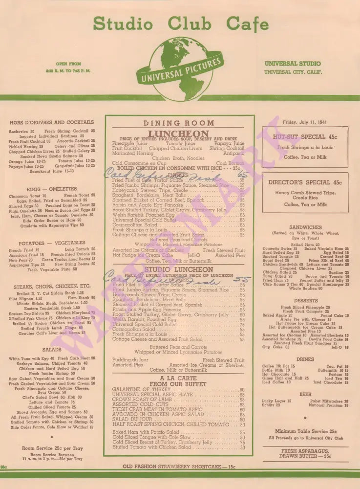This luncheon menu is from 1941 when B movies such as Riders of Death Valley, too Many Blondes and Bachelor Daddy were being released.