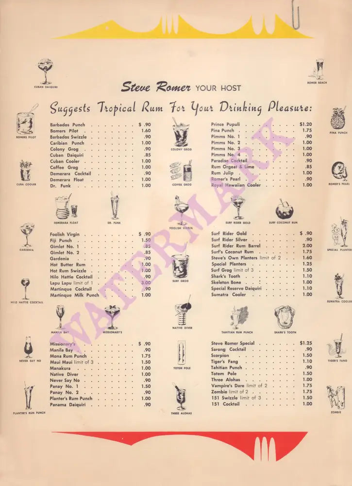 This fine example of mid-century vintage menu art illustrates 1950s California’s love of surfing and Tiki culture.