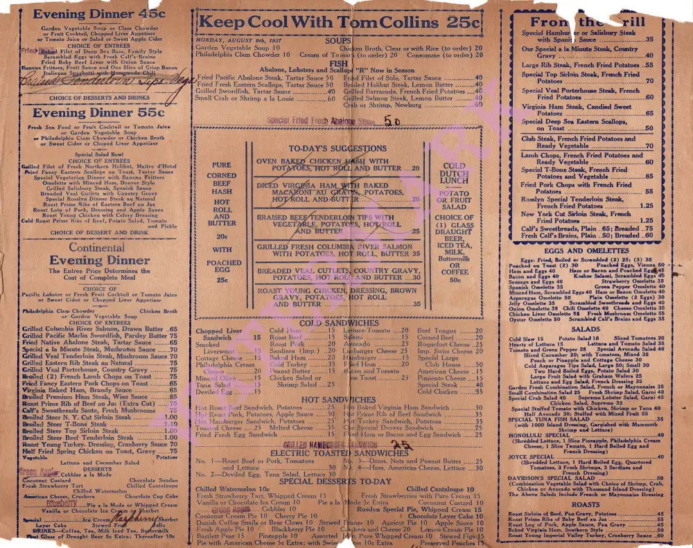 There was a Continental Evening Dinner with prices ranging from 64c to $1 per person, depending on the price of the entrée, and a Grill selection. The menu also featured Electric Toasted Sandwiches – obviously an exciting culinary innovation at the time.