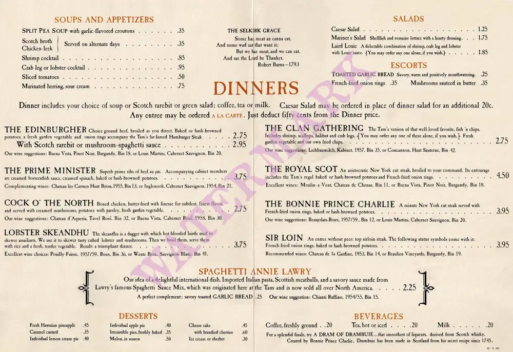 This marvelous 1961 menu featured a clan gathering on its front cover and offered Scottish themed dishes inside.
