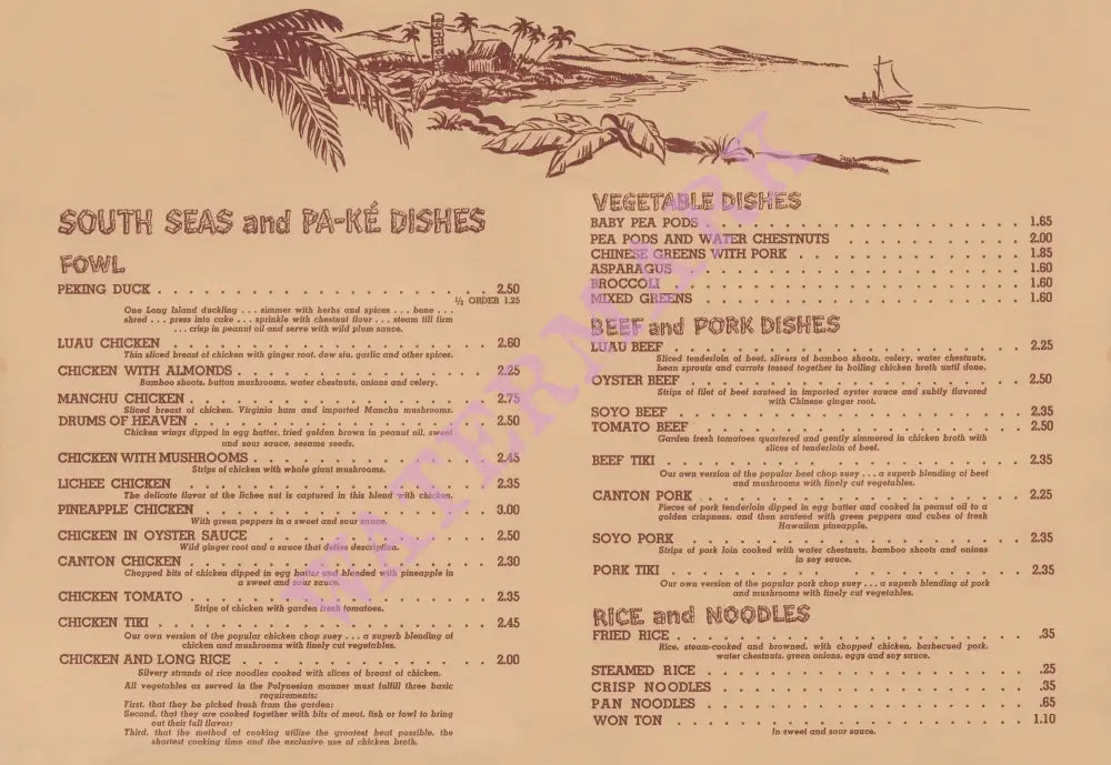 Elaborate flaming cocktails, described as ‘island symphonies of rare and distinguished rums,‘were served in ornate Tiki-style mugs and the six-page food menu included (Fridays-only) Aku and Mahi Mahi flown in from Hawaii.