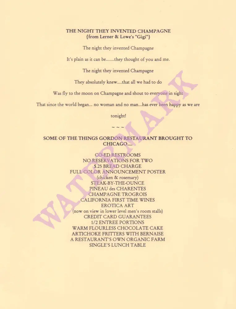 According to Judi Radice’s book, “Menu Design”, the designer David Bartels believed menus “should be provocative and help start conversations among patrons. This menu art, for Gordon in Chicago, uses a primitive style of illustration and mysterious elements to break the conversational ice.”
