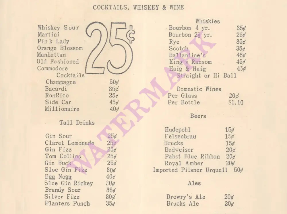 Post-prohibition drinks menu with cocktails starting at $0.25c.