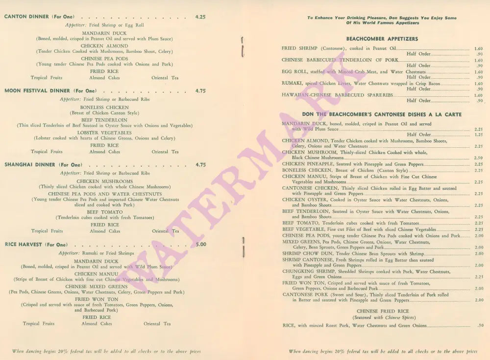 It offered potent rum cocktails, décor with a tropical island theme and exotic cuisine that he called South Seas islands food, but was actually standard Cantonese fare. Hollywood stars such as Marlene Dietrich, Bing Crosby, Vivien Leigh and Clark Gable patronized the place and were rewarded with their own monogrammed chopsticks to make them feel at home.