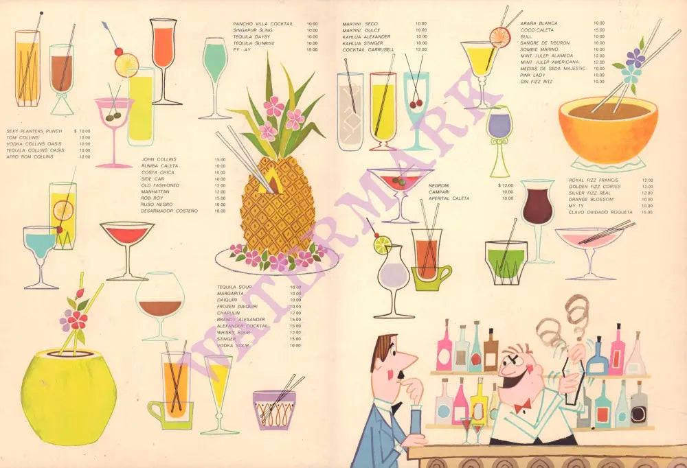 This colorful and witty drinks menu was from the Caleta, one of the first of the grand old hotels in Acapulco, the beach resort town along Mexico's Pacific coast.