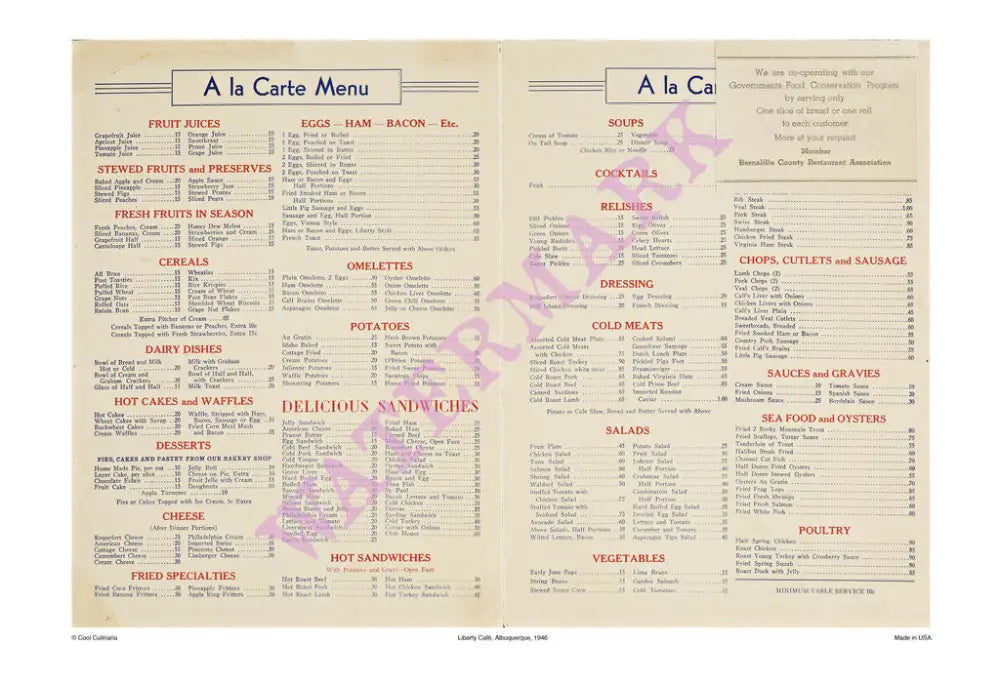 There's so much to love about this wonderful old menu from 1946. There's its sense of history and the fact that its colors are as rich today as they were when the menu was first printed. We are also amazed that a little restaurant in Albuquerque offered imported Russian caviar for a dollar. The Liberty Café was said to be one of the best places to eat on Route 66. It was opened by a Greek-American and billed itself as "A Restful Nook for Thirsty Travelers." A huge neon sign advertised its presence.