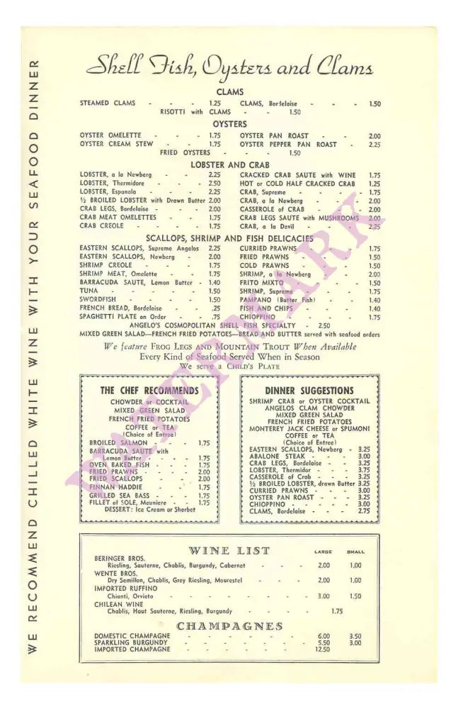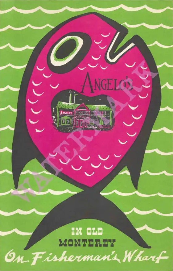 This gorgeously colored menu was printed for Angelo's Restaurant on Fisherman's Wharf in Monterey. Famous, of course, for its seafood dishes, the restaurant also offered great pizza in its equally colorful premises right on the water's edge. The restaurant was owned by Angelo Di Girolamo, who is still a resident of Monterey