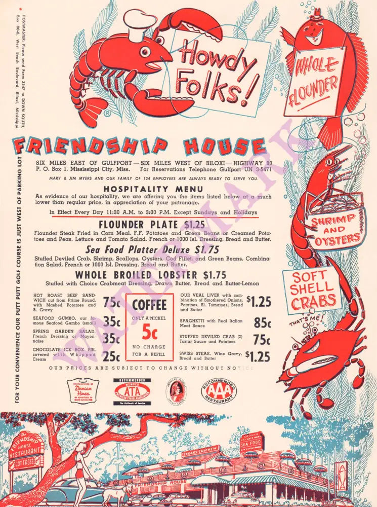 The Friendship House's motto was "Host to the Gulf Coast" Where Hospitality Prevails. According to one customer "it served some of the greatest seafood on the Gulf Coast." Tourists returned year after year until 1963, when the couple sold The Friendship House to a company that operated restaurants in New Orleans. It didn’t retain its loyal clientele and the building was eventually demolished.
