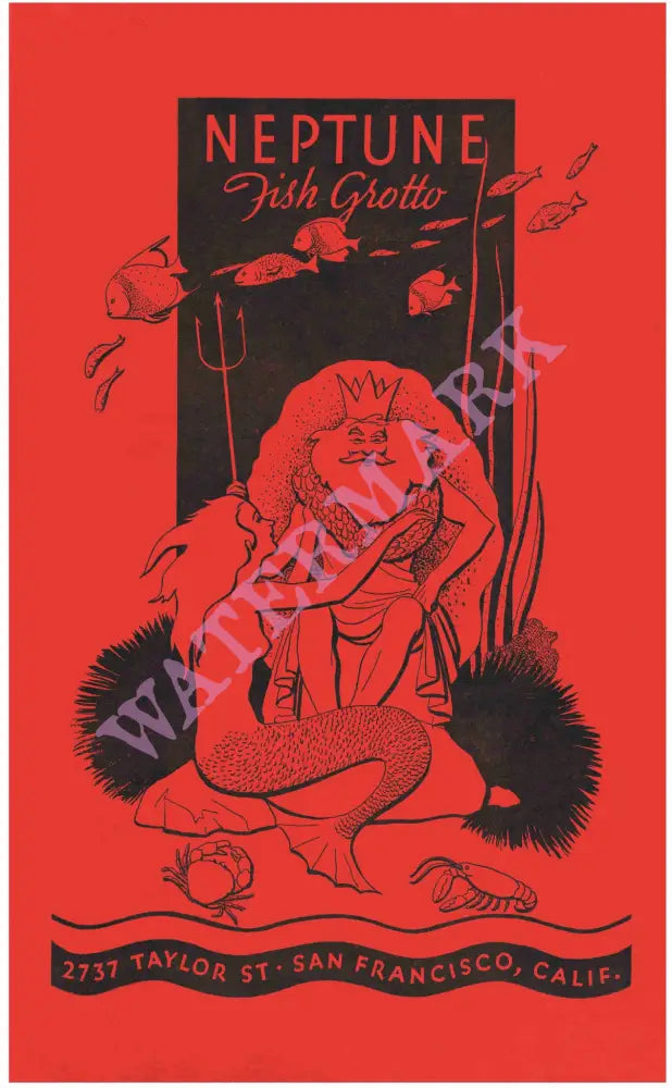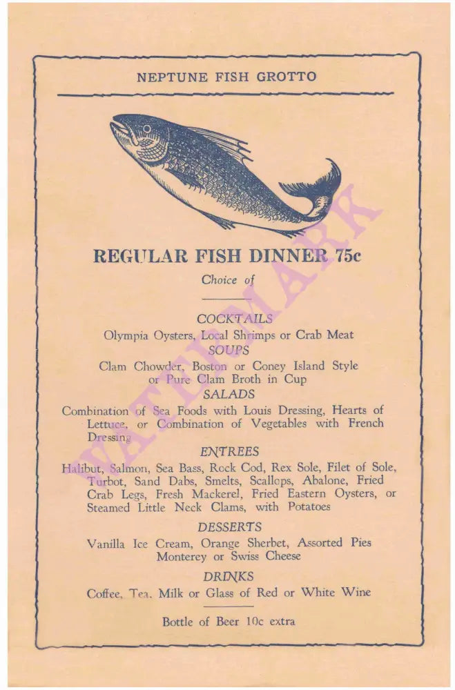From Croatia.org: "One of the first good fish eating places upon approaching Fisherman’s Wharf is the Neptune at 2737 Taylor Street. The proprietors are Robert Soljack and Ernest Aviani from the Island of Brac, Dalmatia, Croatia. Robert Soljack claims five years of experience at Fisherman’s Wharf and he and Chef Aviani took over this historic location about one year ago in 1936. They renovated the building, made some changes and today have a comfortable eating house and surely a suggestion of good sea food with the open kitchen and charcoal broiler. When lunching or dining at the Neptune one may eat at the counter, or at open tables or in booths. About 140 persons can be accommodated at one time. The place is famous for its cioppino, fried crab legs, abalone, deviled crabs, charcoal broiled fish of various types, and other seafood specialties. Fish is bought from the boats when they arrive from the sea at Fisherman’s Wharf, and is served the same day. Menus are made out according to fish available. Some 300 meals are served daily. With such food, with such panorama of hills and bay, with such a picture of fishing scenes, a net mending, of crab cooking, of displays of fish for sale, of the teeming life of those who make their living by the sea spread before one, it is indeed a treat of treats to enjoy a fish dinner prepared as the specialists of the Neptune know how to cook it, and thus enter into one of the typical phases of life in San Francisco."