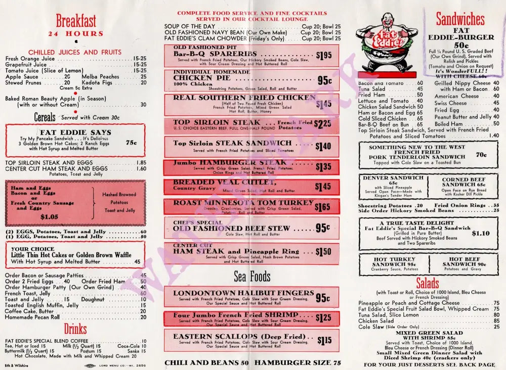 This colorful menu showing Fat Eddie as a walking, talking, smiling hamburger-man advertised the Eddie-burger, a quarter pound of US Graded Beef, served with relish and pickles (tomato and onion on request). The date was 1956 and the hamburger cost 50c.