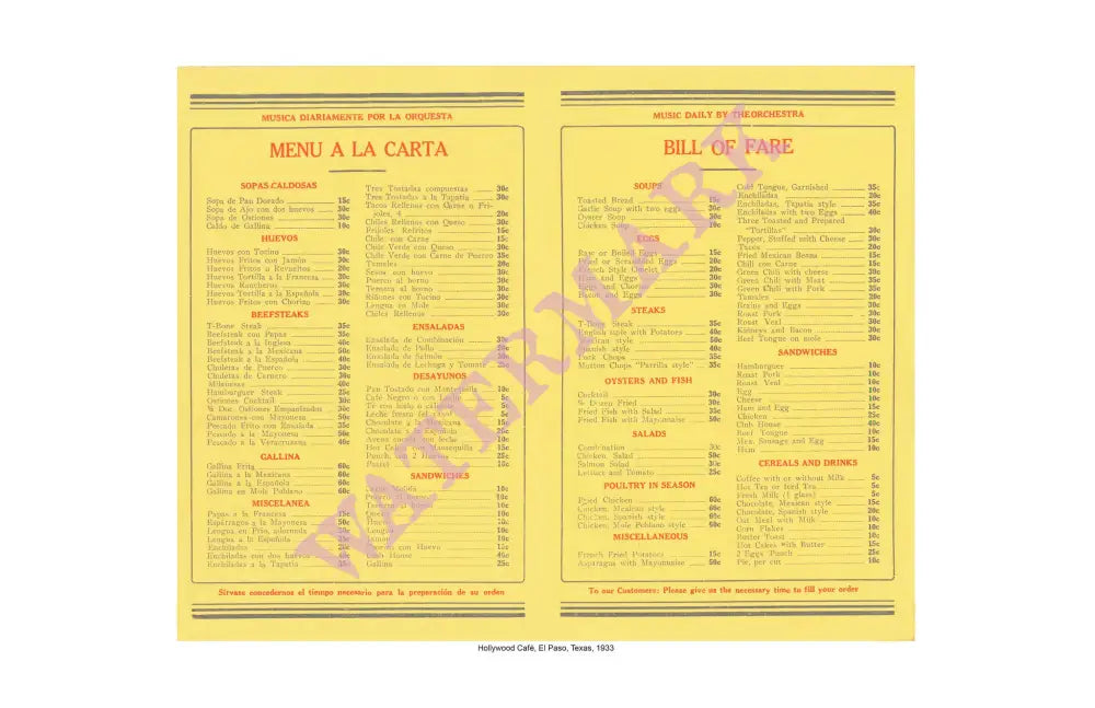 El Paso, Texas, in the 1930s, must have been an interesting place. The city that started out as a sleepy, dusty little adobe village had evolved in a flourishing frontier municipality. Conrad Hilton opened his first hotel in El Paso during this era and the airport which had been built a few years earlier in 1928, vastly increased the number of visitors. This menu from The Hollywood Café and Nightclub marks this innovation by featuring a little propeller plane flying overhead. The restaurant was open 24 hours and had a house orchestra which played daily to liven things up. The bill of fare was presented in both Spanish and English. El Paso Street, where the restaurant was situated, is the city's first and oldest street.