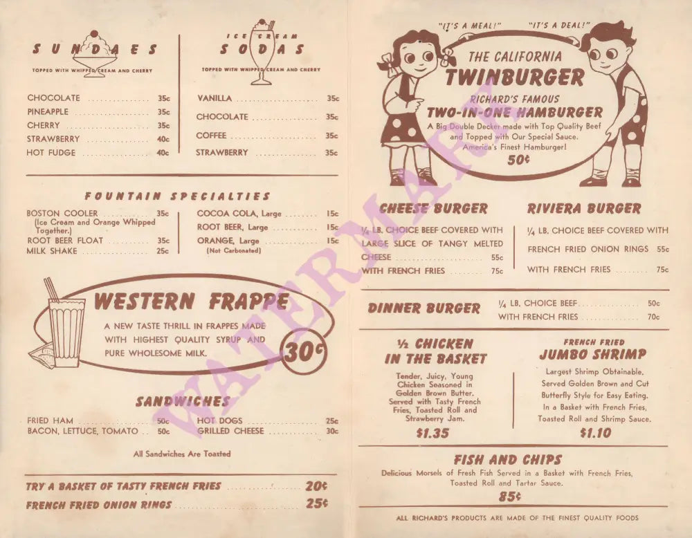 Their top seller was the famous California Twinburger – cost was 50c in this 1950s menu – as well as various fountain specialties like root beer floats and milk shakes.