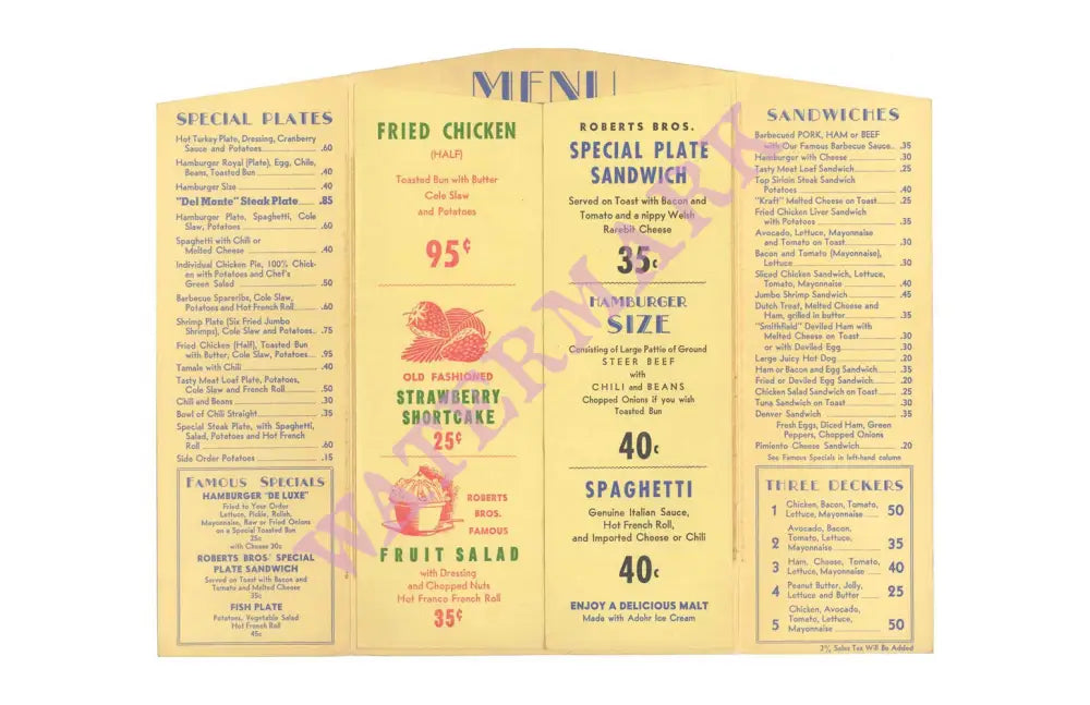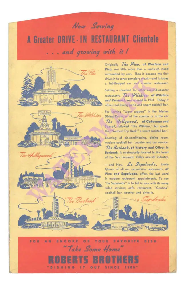 Roberts Brothers was a small chain of five drive-in restaurants spread throughout metropolitan Los Angeles, with the catchy logo ‘dishing it out since 1900.’