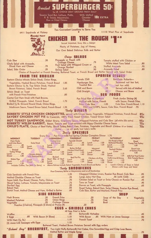 Roberts Brothers was a small chain of five drive-in restaurants spread throughout metropolitan Los Angeles, with the catchy logo ‘dishing it out since 1900.’
