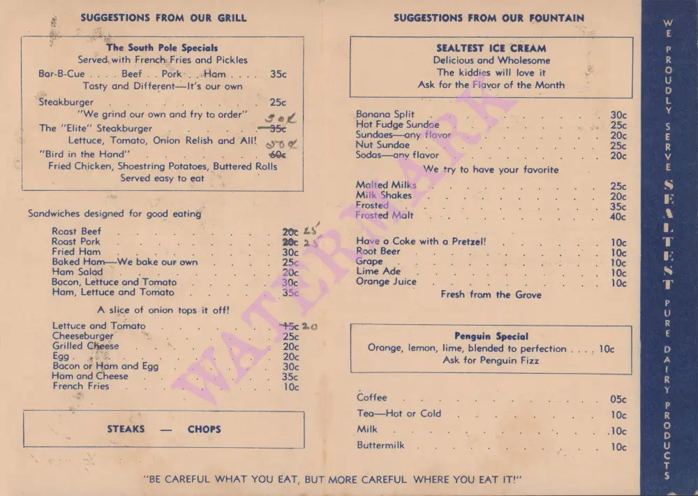 On the back of the menu, a penguin asked customers to tell their friends about the establishment, noting that the menu was ‘stolen from The South Pole Drive-In.’