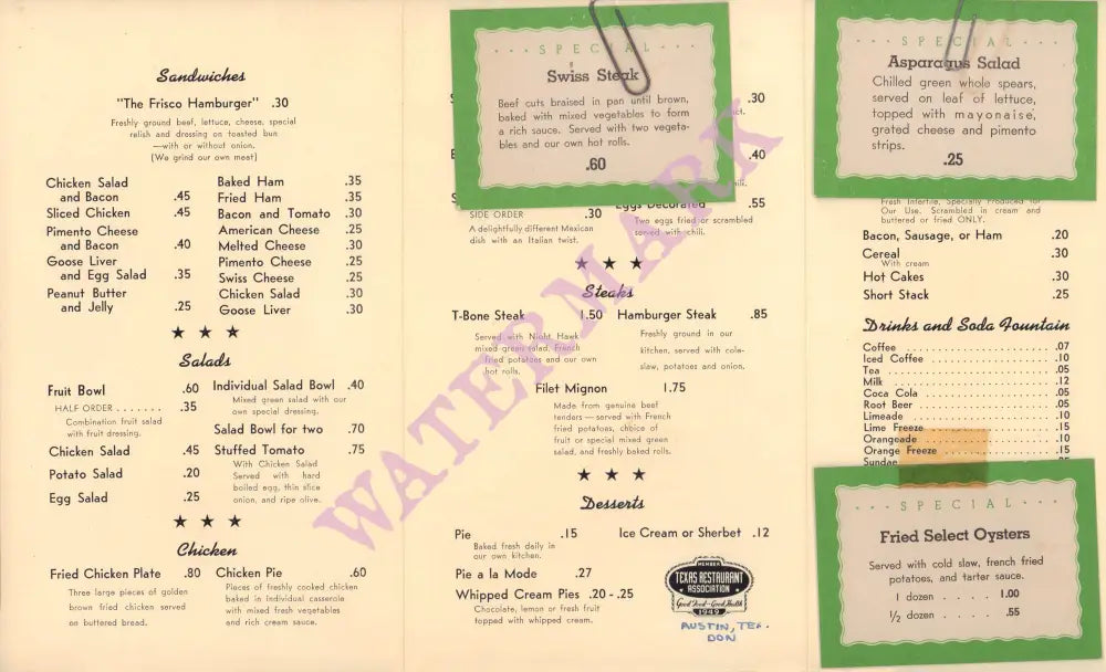 His small restaurant in an abandoned fruit stand on the corner of Congress Avenue and Riverside Drive had only two booths and a counter with eight stools. Hamburgers cost 15c. The extended hours proved popular and free coffee was served from midnight to 6am.