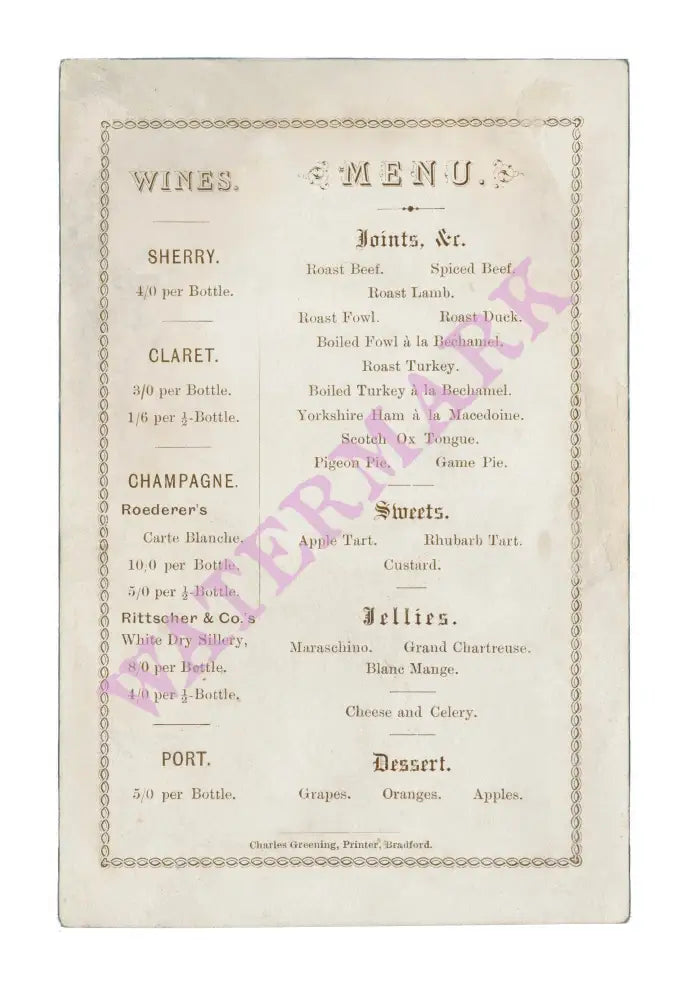 This 1885 menu illustrates how wealthy the northern English city of Bradford was at the end of the 19th century. Hence British playwright and poet T.S. Eliot's line from The Wasteland: "As one on whom assurance sits, as a silk hat on a Bradford millionaire." The rugby football club's annual ball was a real feast. Attendees were offered five different roasts, two pies, two boiled birds and the local Yorkshire ham. There was a choice of two great English puddings, apple and rhubarb tart with custard. Two champagnes were also on offer, Roederer's Carte Blanche (Extra Dry), and a long lost house and style, Rittscher's White Dry Sillery, the still champagne that was featured widely on wine lists in the latter part of the 19th century but has now virtually vanished. The floral menu cover design was typical of the era.