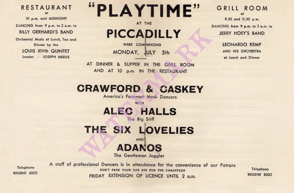 Musical evenings at London’s Piccadilly Hotel used to be relayed to dance halls across London. This performance in 1937 was relayed to the Hackney Empire: "Billy Gerhardi is a South African, born in Durban.  Tiring of the job of selling orange groves and houses in the sunny Union, he came to London with his violin tucked underneath his arm. His first job was as violin and conductor of "The Ragpickers," an American team playing at the Hammersmith Palais de Danse, but he was quickly in the West End spotlight where he has remained ever since." From arthurlloyd.co.uk.