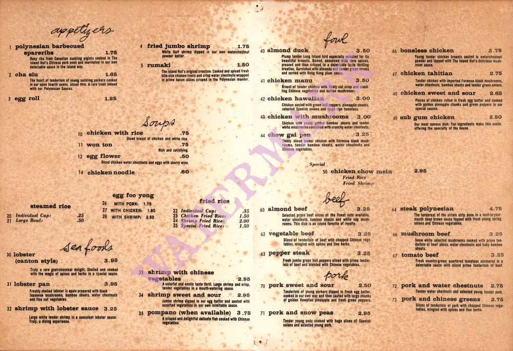 It also had a tiki lounge where people imbibed exotic drinks with names like Nui Nui, Tahitian Punch and Devil’s Mask, an Aloha banquet hall and two restaurants including the Island Hut.