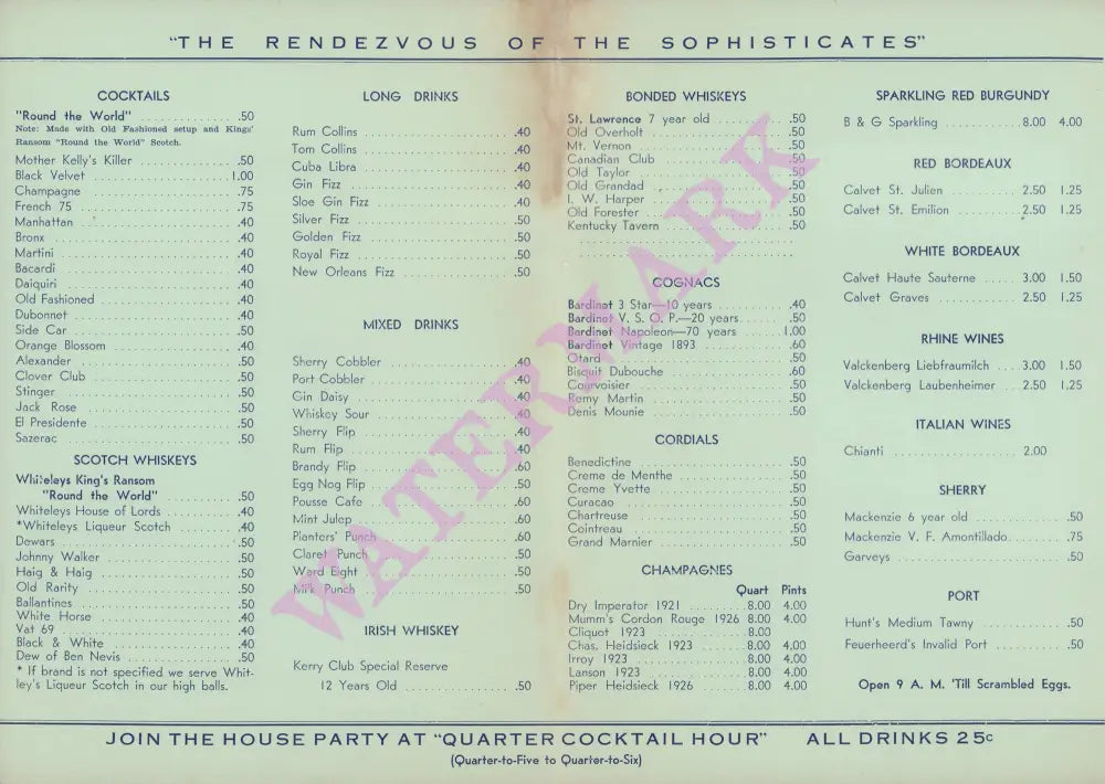 He declared Mother Kelly’s (his nickname) The Rendezvous of The Sophisticates and One of The Most Famous Bars in the World.