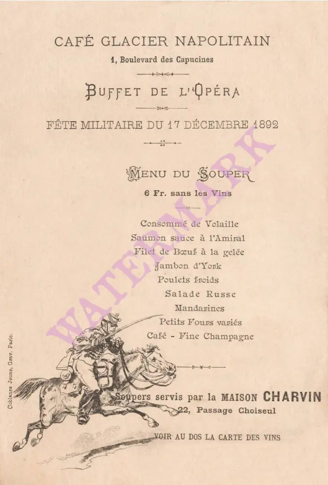 This very early menu dated 1892 is from the Café Napolitain, one of the grand cafes which stood at number 1 Boulevard des Capucines in Paris. Its military theme was a celebration of the Franco-Russian Alliance, which had been drafted two months earlier, and which lasted until the outbreak of the First World War.