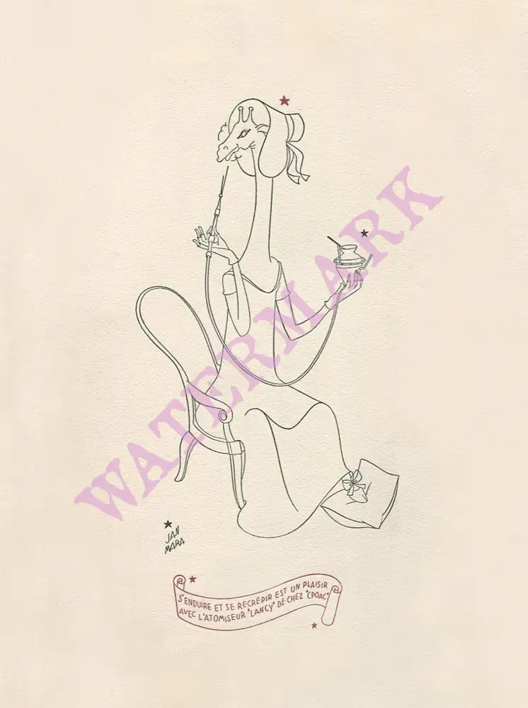The artist Jan Mara was born in 1912 and died in 1992. He was famous for his slightly surreal portraits of contemporary showbiz stars and philosophers as well as his humorous creations such as this “giraffe lady” spraying herself over and over.