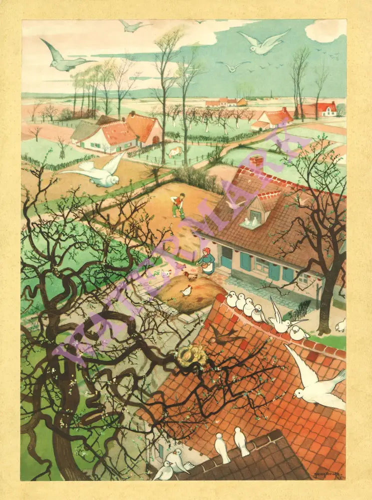 This delightfully detailed illustration is one of a series created in 1947 by the French artist Jean Droit (1884-1961) and later used as a menu cover for the highly regarded restaurant called Le Canterbury in Brussels, Belgium.