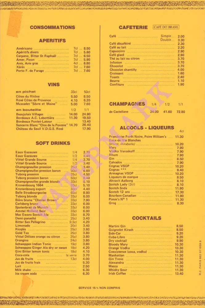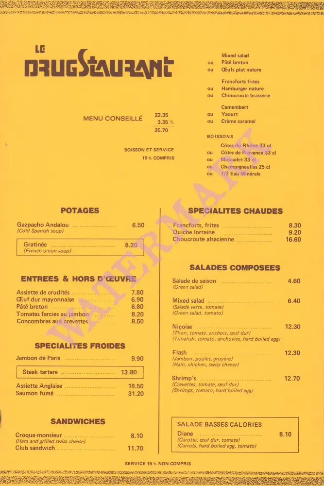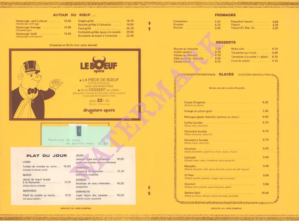 This marvelous 1970s menu was from the Le Drugstore in the Opera neighborhood of Paris and reminds us of a film poster or an album cover.