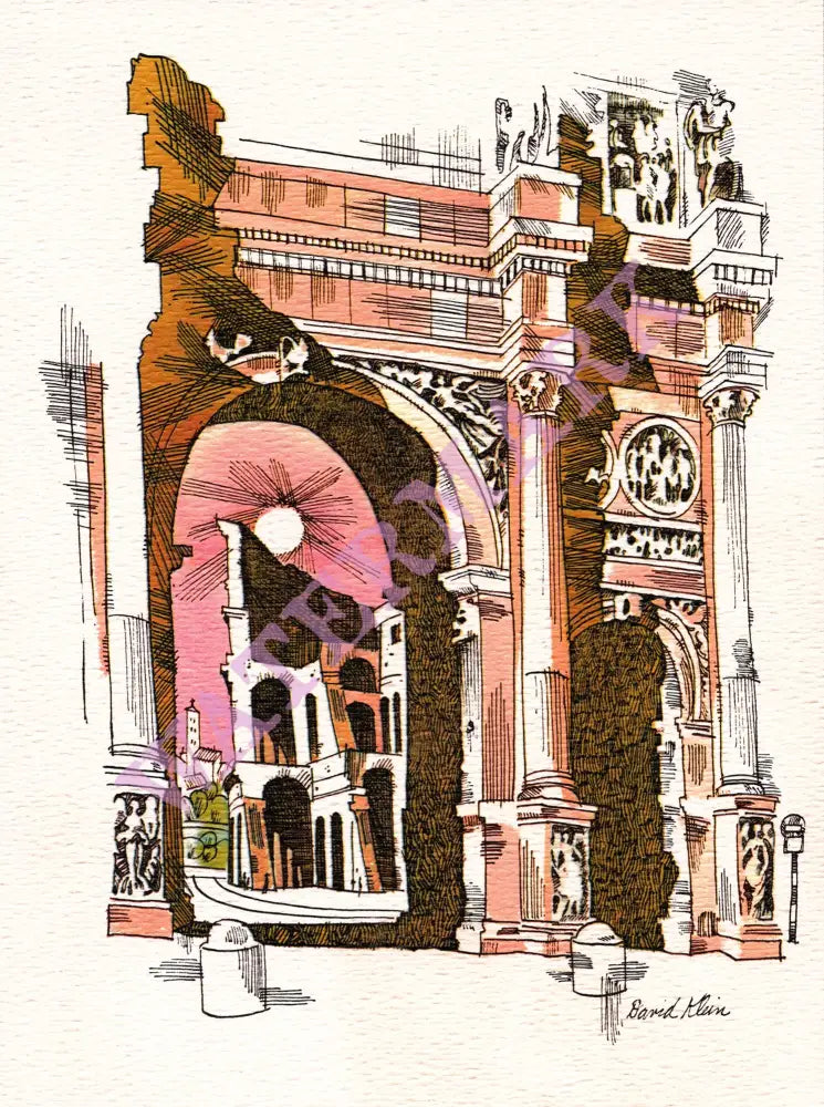 This beautiful image of the Triumphal Arch of Constantine in Rome was created by the influential American artist David Klein, who produced posters for Broadway theatre productions, Hollywood films, the US Army and various corporate clients.