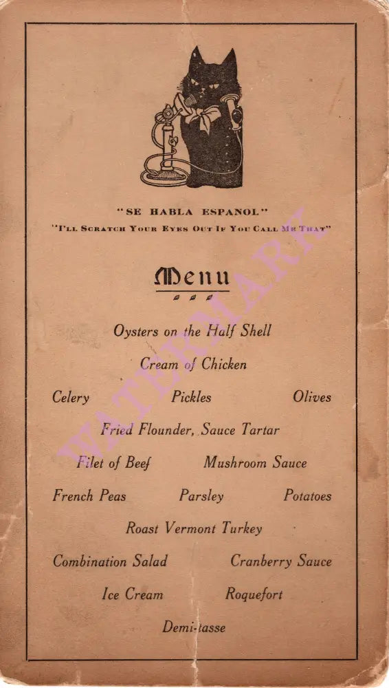 At the top of the written menu is a splendid, be-ribboned black cat using an old-fashioned telephone and having an imaginary conversation.